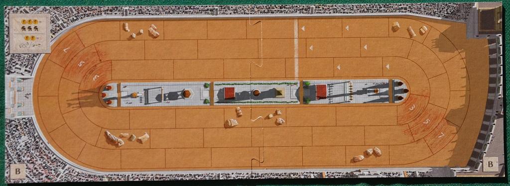 CHARIOT RACE mette da 2 a 6 giocatori alla guida di antiche bighe romane in una corsa all’interno di un anfiteatro. Scelto il percorso (“base” sul Lato A del tabellone, “avanzato” sul lato B) i partecipanti sorteggiano le posizioni di partenza e preparano la loro plancia personale, sulla quale terranno conto della velocità del loro carro, dei danni subiti e dei favori del Fato.