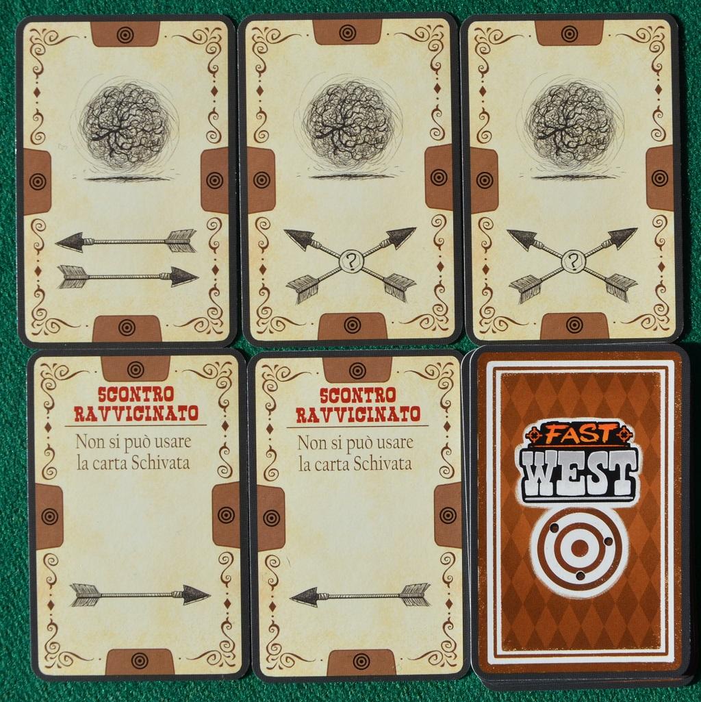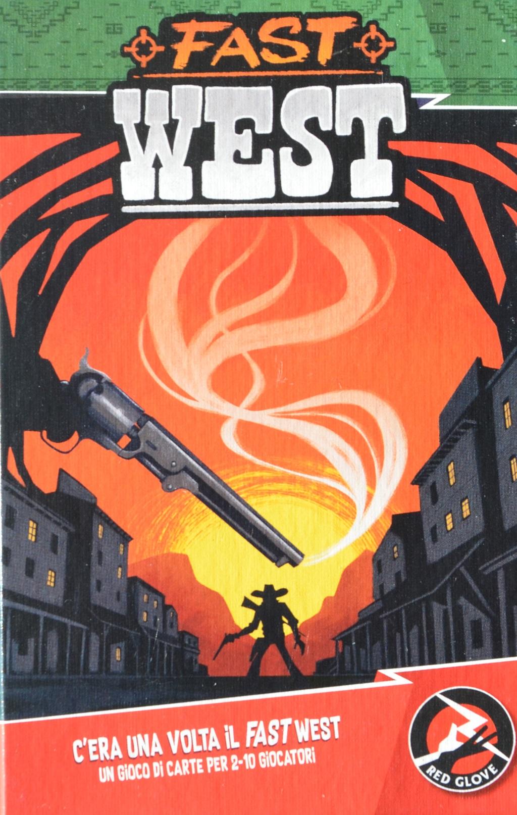 FAST WEST è un gioco di carte che ricorda molto l’ormai classico BANG: si gioca anch’esso avendo come ambientazione il Far West americano, mentre i giocatori impersonano un pistolero e hanno in mano delle carte “Azione” con pistola, fucile, dinamite, schivata, ecc. Tutti partono con un solo “colpo in canna” e possono utilizzarlo per sparare una pistolettata: altrimenti è necessario cercare prima di accumulare altre pallottole per usare il fucile (spendendo 2 proiettili) o la dinamite (5 proiettili).