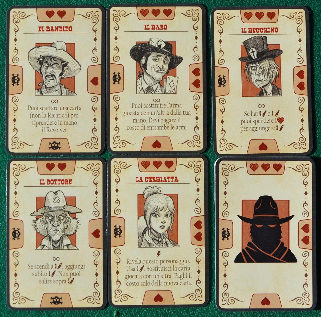 Ogni pistolero inizialmente è anonimo (tenere la carta coperta) e parte con 3 punti vita: viene eliminato dal gioco se (o quando) arriva a zero: non ci sono possibilità di recuperare, quindi bisogna fare attenzione. Sul retro della carta sono indicati invece il nome del personaggio e la sua abilità speciale: una volta girata la carta resta così fino a fine partita e il pistolero ha un punto vita in meno.