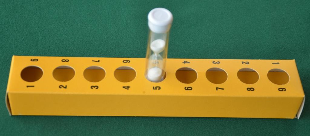 Una difficoltà aggiuntiva arriva dall’uso della clessidra: i giocatori hanno infatti un minuto circa per eseguire il proprio turno. La clessidra viene azionata dal giocatore inattivo ed è posata inizialmente sul foro centrale della consolle segna-punti, in corrispondenza del numero “5”: ogni volta che un giocatore fa terminare la sabbia durante il suo turno il suo avversario prende la clessidra e la sposta di un foro, facendola ripartire. Se un giocatore esaurisce la clessidra quando si trova nella casella “9” (l’ultima) deve concedere la partita.