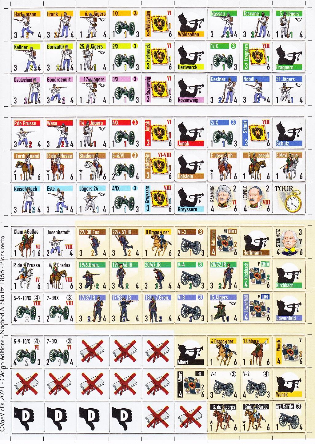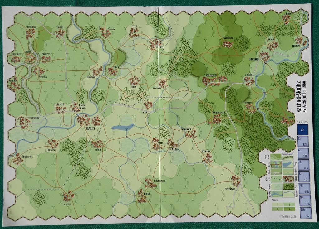 NACHOD & SKALITZ sono le due battaglie del quarto “volume” della serie “Les grandes batailles de Napoleon III” e ci trasportano in Boemia, all’inizio della guerra Austro-Prussiana del 1866. Le unità mostrano un valore (PF), una capacita di movimento (PM) e il numero di passi di perdita (PP) che possono sostenere, mentre l’artiglieria ha anche una distanza max di tiro. Tutte le unità devono essere orientate su un lato di esagono per avere tre esagoni di “fronte” e tre di “fianco”.