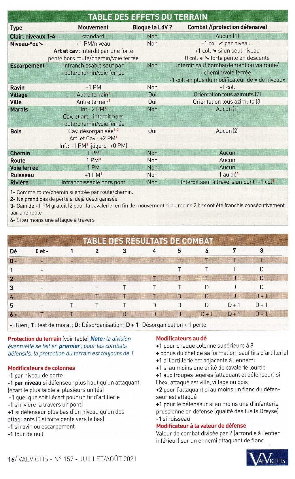 Poi tocca al difensore iniziare lo scontro con un fuoco di sbarramento: ogni unità può sparare ad uno o più degli attaccanti dividendo i suoi PF a piacere fra gli esagoni di fronte (attaccare con “0” dunque è possibile). Le unità attaccanti rimaste in gioco potranno finalmente eseguire i loro attacchi (singoli o coordinati) utilizzando sempre una tabella di combattimento che indica il numero dei PF impegnati in ogni scontro (da 0 a 8): si verifica se ci sono modificatori che spostano la “colonna” dell’attacco ed infine si tira 1D6 (che può essere modificato da vari fattori) per ottenere un test di morale, oppure la disorganizzazione delle unità con o senza perdite.
