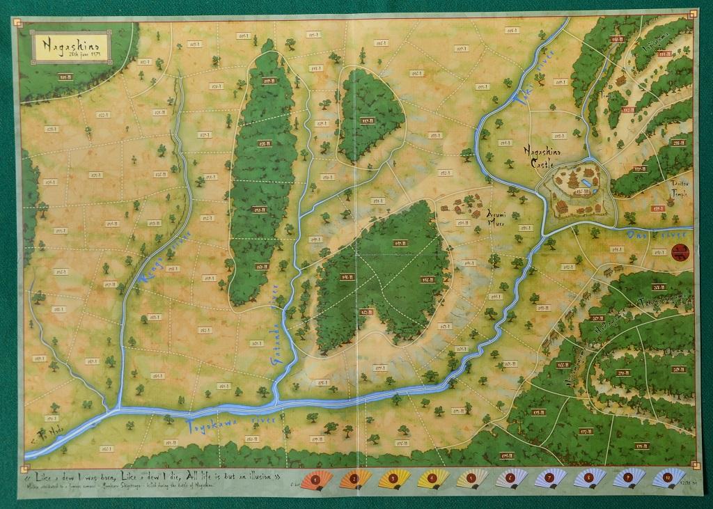 Con il termine “Sengoku Jidai” (stati belligeranti) si indica una parte piuttosto turbolenta della storia del Giappone che va dal 1493 al 1590: fu un periodo molto sanguinoso e furono combattute circa 50 battaglie maggiori, fra le quali troviamo, appunto, NAGASHINO e SHIZUGATE. La mappa (420x595 mm) è stampata da entrambi i lati (uno per ogni battaglia) ed è del tipo “a zone”, fra loro separate da diversi tipi di “confini”. Zone e confini regolano il movimento e l’impilamento della unità