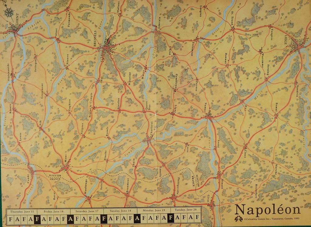 NAPOLEON è un gioco di simulazione a scala "strategica" dove le battaglie si risolvono però a livello tattico. La mappa mostra la zona dove si svolse la campagna di Waterloo dal 15 al 19 Giugno 1815, dai confini settentrionali della Francia fino alla zona nord del Belgio: sulla mappa sono stampate città e paesi (il cui nome è ormai noto a tutto il mondo, proprio a causa della battaglia) collegati fra loro da strade principali e secondarie.