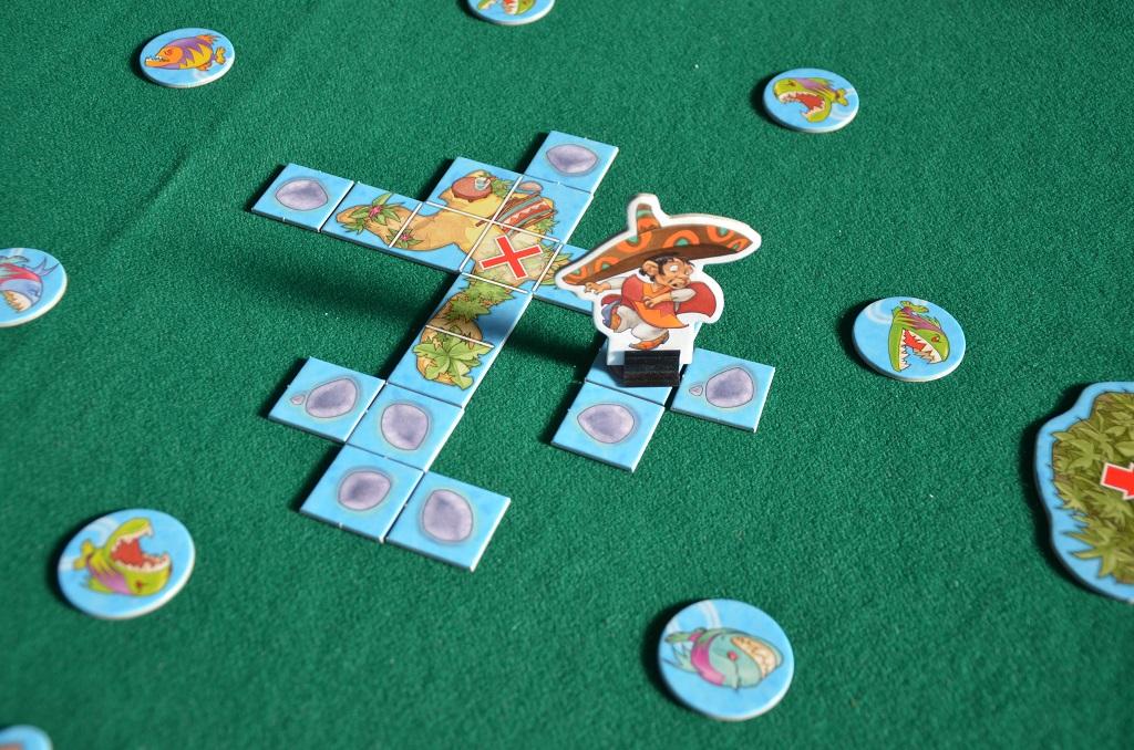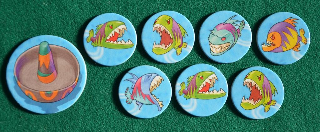 Se sul suo percorso Pedro dovesse finire in acqua il giocatore che lo sta muovendo deve giocare una tessera “pietra” in modo da mantenerlo… all’asciutto. Se un giocatore finisce le pietre e non può salvare Pedro la partita si arresta ed il “colpevole” deve raccogliere un dischetto Piranha dal tavolo (attenzione, con 2 dischetti si è eliminati). Se Pedro arriva su uno dei quattro isolotti esterni muore ucciso dai cannibali, mentre se una tessera “pietra” tocca un dischetto Piranha questi “simpatici” pesciolini lo divorano vivo: in entrambi i casi il giocatore che lo doveva muovere prende un dischetto.
