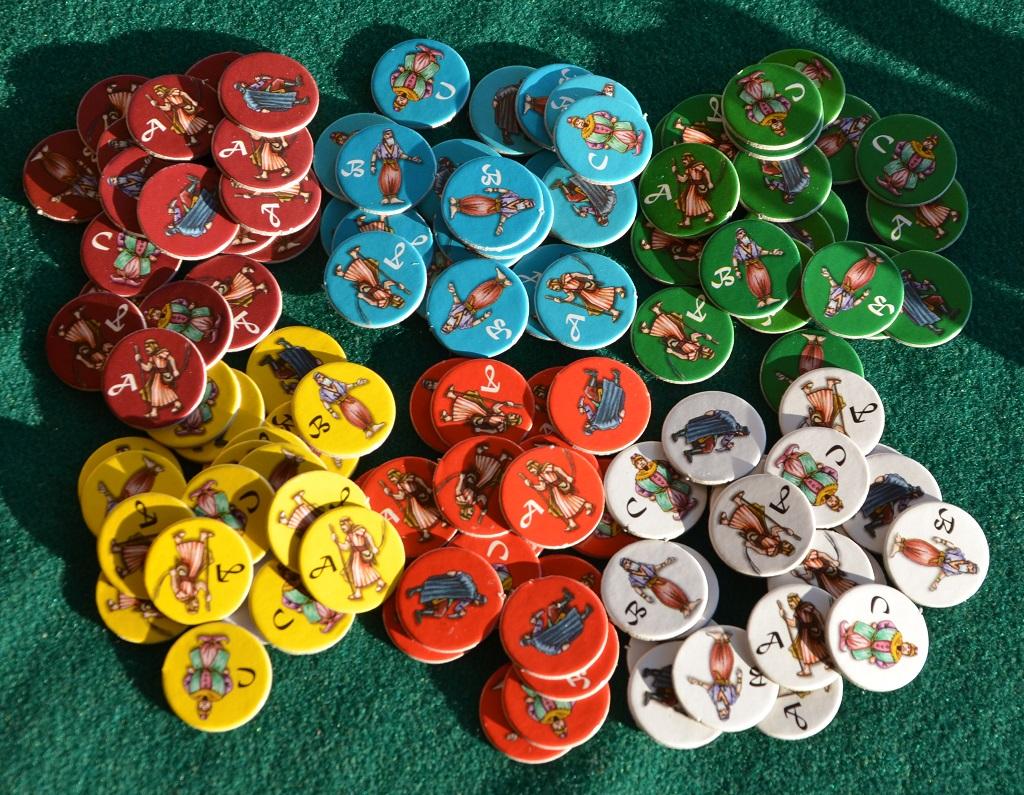 THIEVES OF DI BAGDAG ci trasporta nel… medio Oriente e trasforma i giocatori in altrettanti ladri di tesori. Il tabellone di gioco mostra una specie di piazzetta sulla quale si affacciano 6 palazzi in perfetto stile da “mille ed una notte”, ognuno con un diverso colore. La scatola contiene quattro set di pedine in legno colorato (12 “ladri” e 4 “guardie”), otto “guardie neutrali” di legno nero, 6 sets di “forzieri” e un mazzo di 110 carte (102 carte “palazzo” in sei colori e 8 carte “danzatrici” che fungono da jolly).