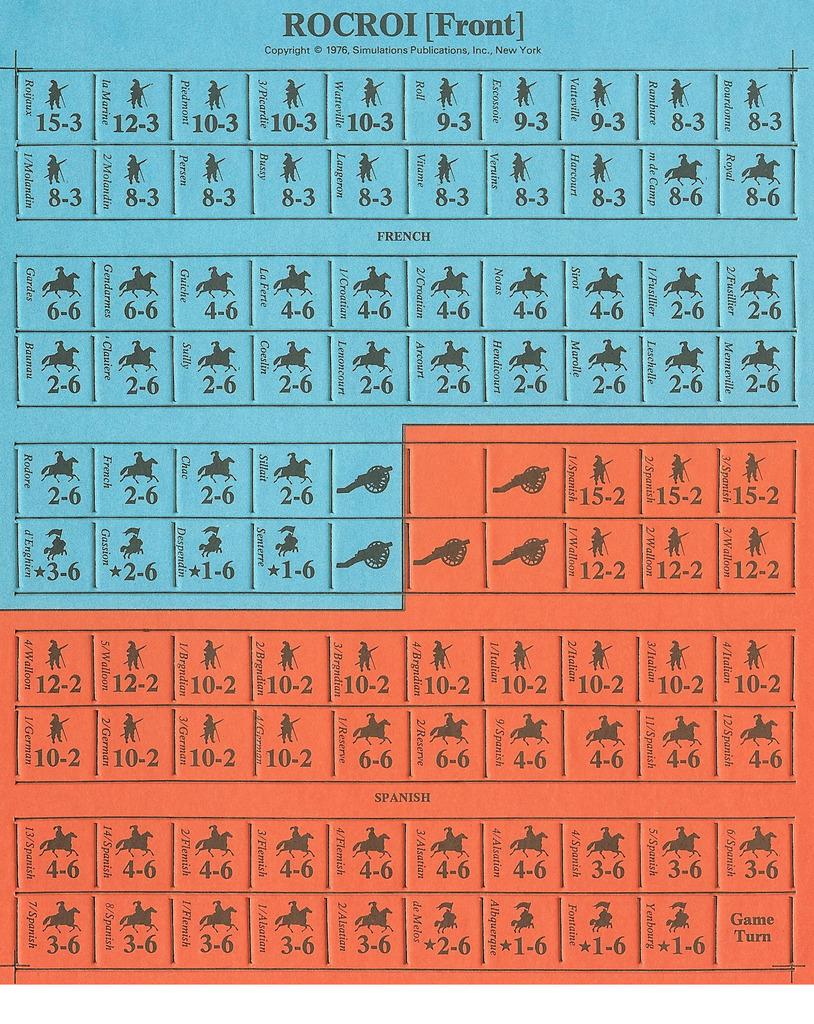 Le “pedine” sono nel formato classico (13x13 mm), stampate in due colori (rosso e blu) con la silhouette del tipo di unità rappresentata e due valori di cui tenere conto: i Punti di Forza (PF) e la capacità di movimento (in Punti Movimento o PM). Su ogni mappa sono poi ripetute le silhouettes e i nomi di tutte le unità sui relativi esagoni di partenza: basta un poco di pazienza e prendere una alla volta le pedine di ogni schieramento per posizionarle al posto giusto.