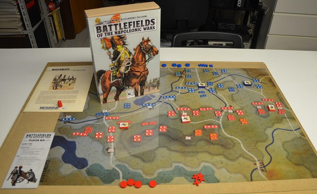 La scatola di BATTLEFIELDS OF THE NAPOLEONIC WARS contiene un regolamento “universale” per tutte le battaglie della serie, quattro mappe con grandi esagoni e quattro pieghevoli con note storiche, setup e tutte le regole specifiche: basta scegliere quale battaglia provare e schierare le unità indicate.