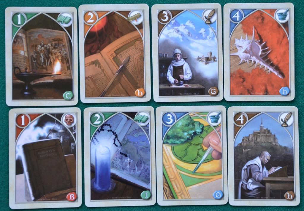 Terminata l’asta i giocatori scoprono le carte acquisite dividendole per colore (blu per i “pigmenti”, verdi per i “libri sacri”, rosse per i “libri proibiti”, gialle per i “manoscritti” e marroni per i “monaci amanuensi”): il giocatore col maggior punteggio (in ogni colore) prende il dado corrispondente (ad esempio il blu, vincendo con le carte pigmento, ecc.) e lo posa davanti a sé. Da notare che il valor iniziale di “3” potrebbe essere cambiato nel corso della partita (vedere sotto). Si sommano i punti ottenuti e chi ha il totale più alto vince la partita.