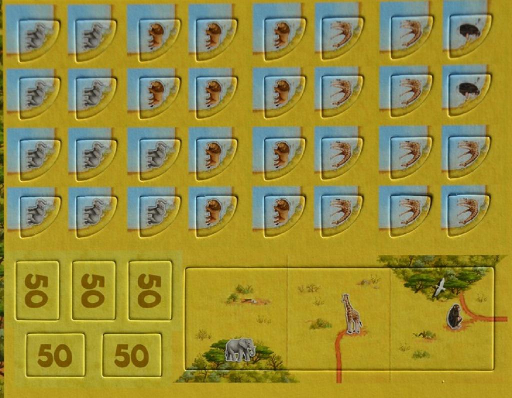 C’è anche una manciata di tesserine (della misura di un quarto di cerchio) sulle quali sono disegnati gli stessi cinque tipi di animali: ad inizio partita ne vengono distribuite casualmente due a persona ed altri se ne possono guadagnare posando un meeple sui baobab (2 tesserine) o circondando di tessere (come nei monasteri) un baobab (di nuovo due tesserine). Esse possono essere usate chiudendo un sentiero o una boscaglia per aumentare il numero di animali e quindi il punteggio: se, per esempio, ho un lenone ed una zebra faccio 3 PV, ma se scarto una tesserina giraffa incasso 6 PV. Possono anche essere usate per creare dei pozzi di abbeverata: invece di posare un meeple sulla tessera appena giocata lo si può mettere su una tesserina sovrapposta all’incrocio di quattro tessere, guadagnando 3 PV. Chiunque posa la seconda tesserina in quell’incrocio guadagna 4 PV, il terso prenderà 5 PV ed il quarto 6 PV: a quel punto la possa è completamente chiusa ed il giocatore può ritirare il suo meeple facendo altri 3 PV.
