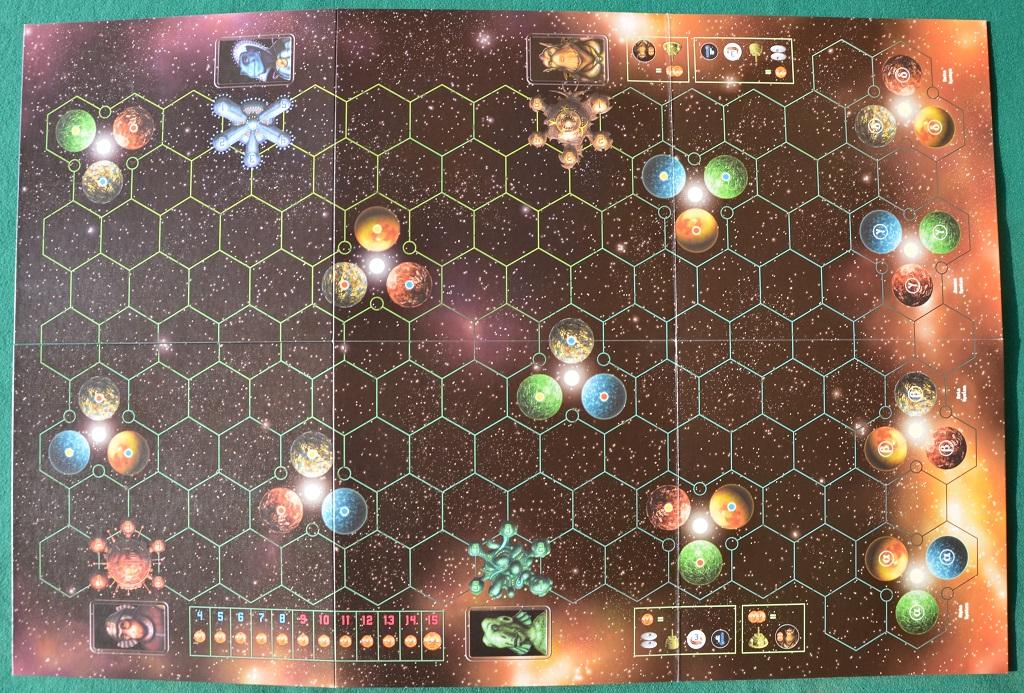 Innanzitutto abbiamo di nuovo un grande tabellone montato ma con esagoni molto più piccoli del solito standard (50 mm soltanto) e sul suo sfondo nero e stellato appaiono pianeti di vario tipo. Sulla parte inferiore del lato corto vediamo quattro sistemi di tre pianeti (denominati alfa, beta, gamma e delta) sui quali verranno piazzate le prime unità dei giocatori all’inizio della partita. Il resto del tabellone mostra quattro basi aliene ed altri 11 sistemi planetari (di tre pianeti l’uno).