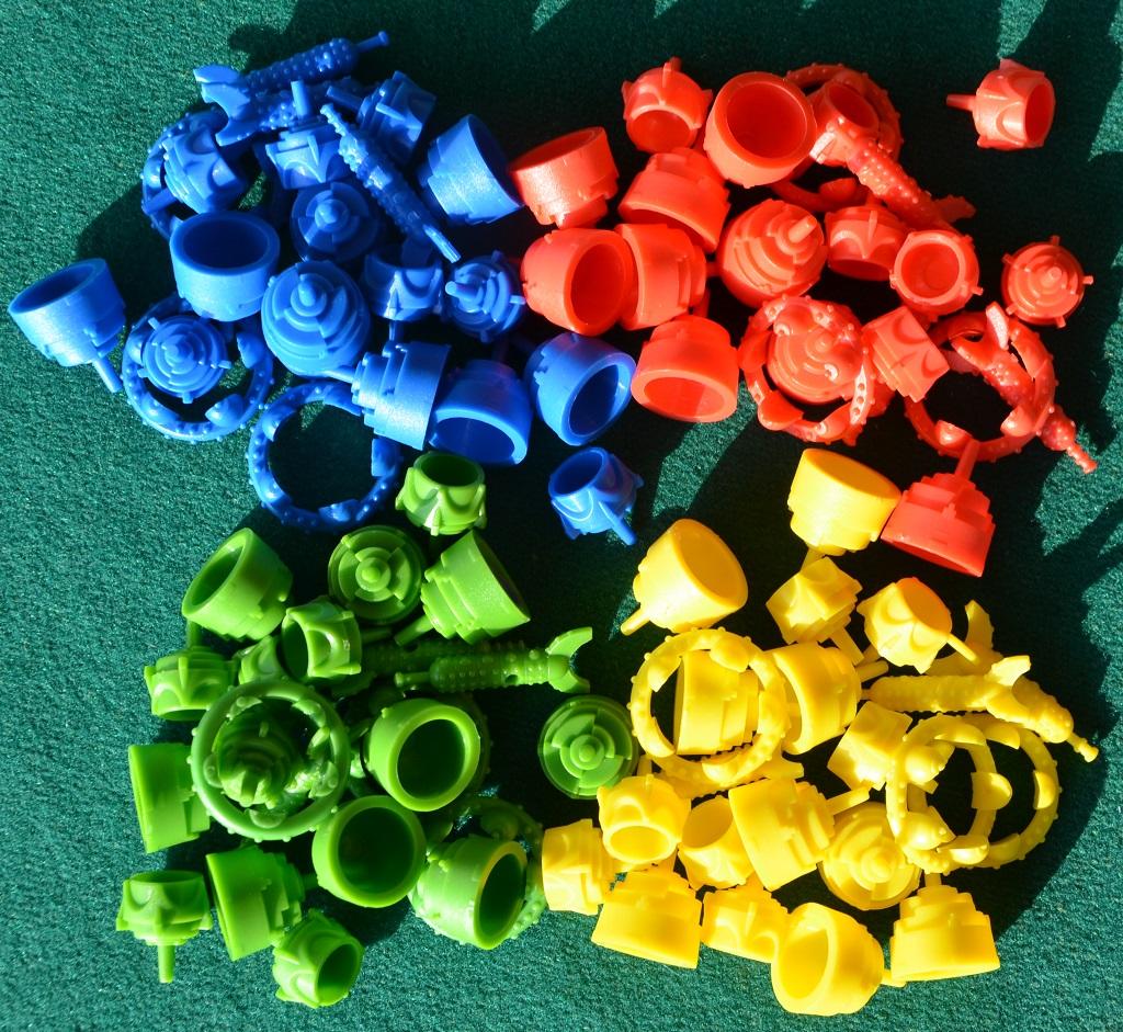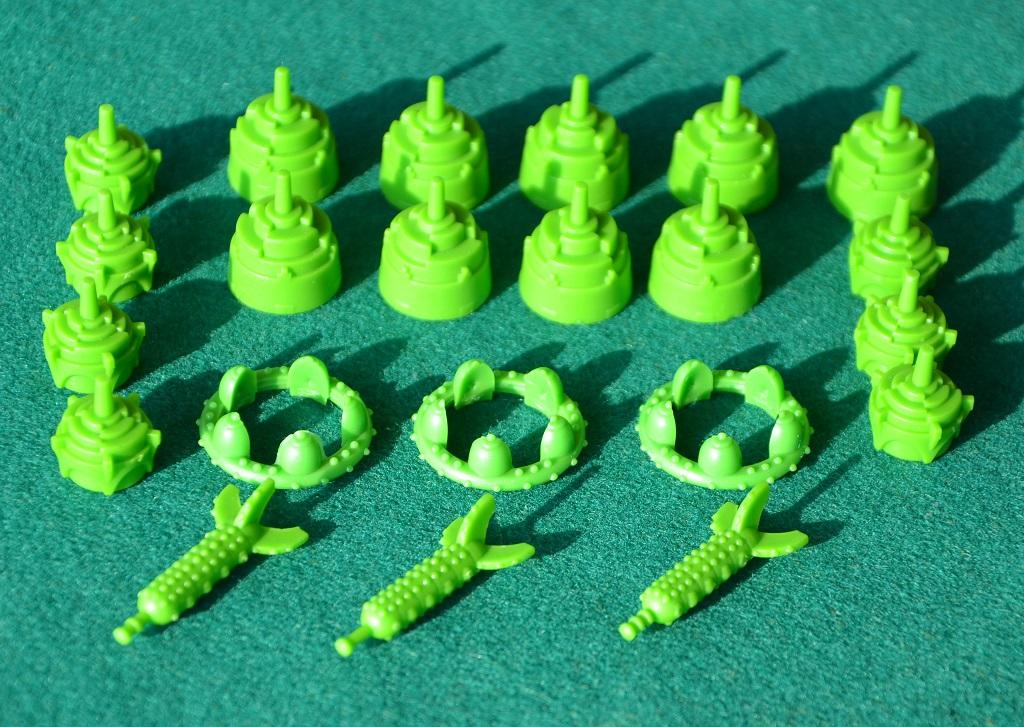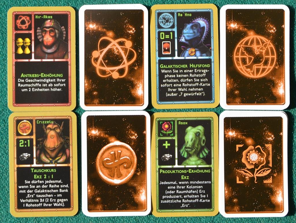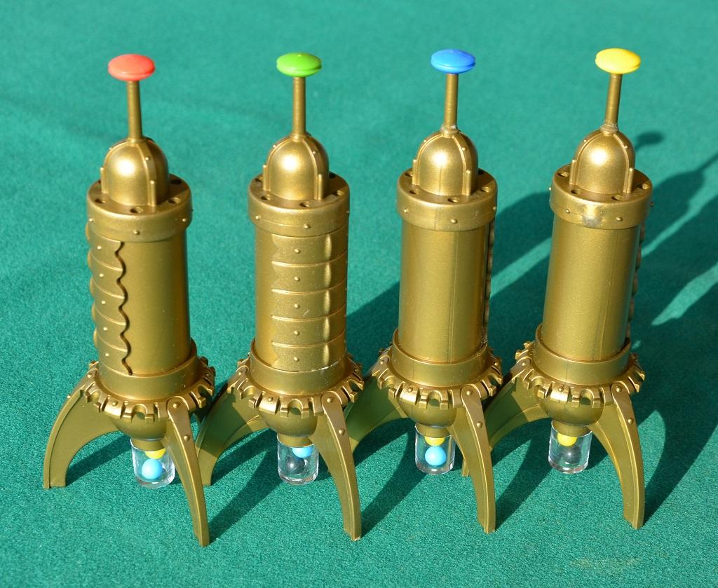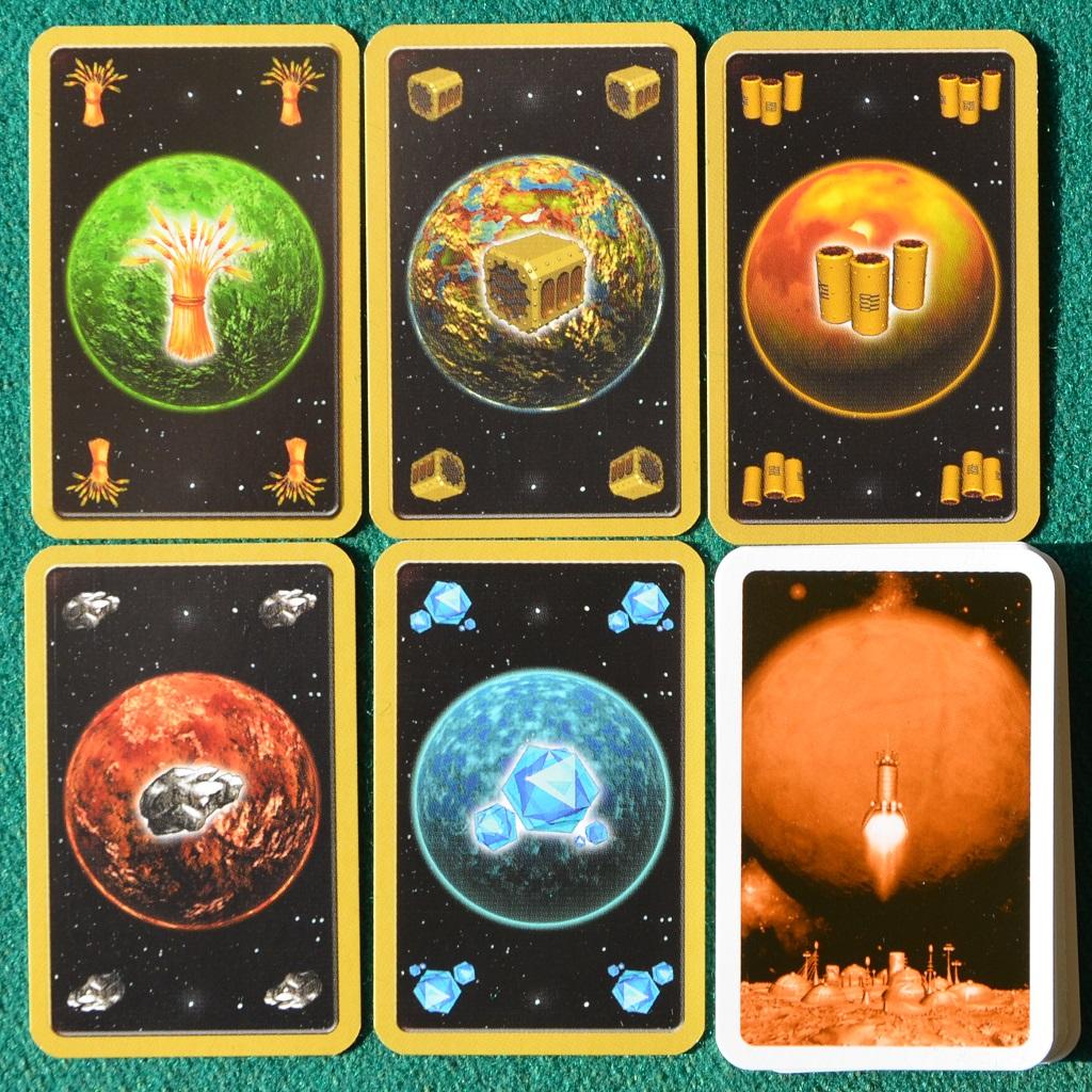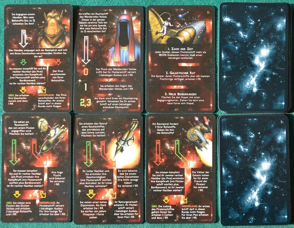 Togliendo il tabellone dalla scatola poi c'è la sorpresa! Spuntano infatti quattro razzi di plastica dorata alti 180 mm (le astronavi "madre") che contengono al loro interno quattro palline colorate (gialla, rossa, azzurra e nera). Anche tutti gli altri segnalini sono di plastica colorata e la confezione contiene un "nuovo" mazzo di grandi carte "Incontro" oltre alle solite cartine per le risorse (cibo, carburante, carbonio, quarzo, merci di scambio).