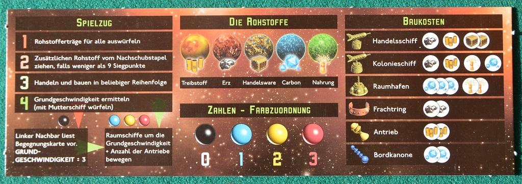 L’acquisizione delle risorse è abbastanza lineare: i pianeti “arancione” danno carburante, quelli “rossi” danno minerali, i “marroni” danno merci, i “blu” carbone ed i “verdi” cibo. Ma già al momento delle costruzioni le cose si complicano un po’ perché bisogna decidere che tipo di nave spaziale acquistare (colonica o commerciale) visto che hanno scopi diversi.