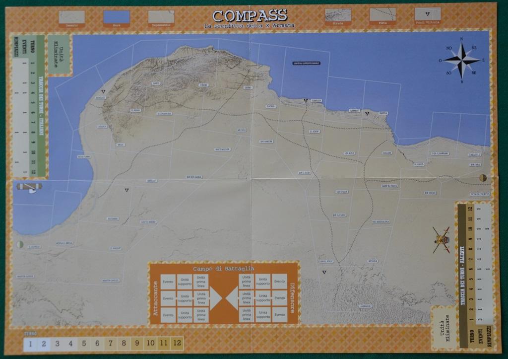 La mappa di COMPASS è suddivisa in “zone” fra loro separate da righe bianche: l’unica caratteristica speciale è la strada costiera che permette alle unità di raddoppiare la loro velocità. Le unità si spostano da una zona ad una adiacente e continuano così in base alla velocità indicata sul counter. Bengasi può essere utilizzata dall’Italiano come base aggiuntiva per fare entrare i suoi rinforzi o rimpiazzi, mentre l’Inglese può fare altrettanto se conquista Tobruch.