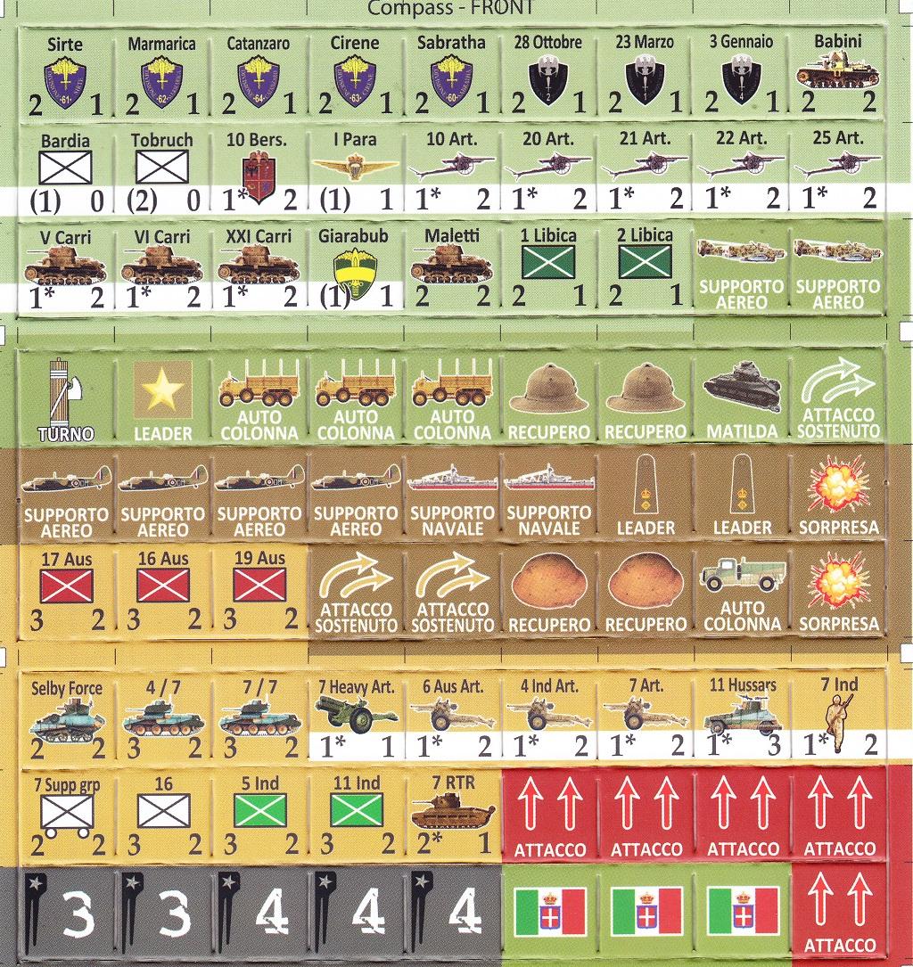 Le unità combattenti che sono caratterizzate da un nome (Sirte, Cirene, Selby Force, ecc.) e da due valori numerici: il primo (a sinistra) indica la Forza di Combattimento dell’unità (in PF), mentre il secondo indica la sua capacità di movimento (in PM). Le unità che hanno un asterisco (*) accanto ai PF possono essere usate come “supporto” al combattimento.