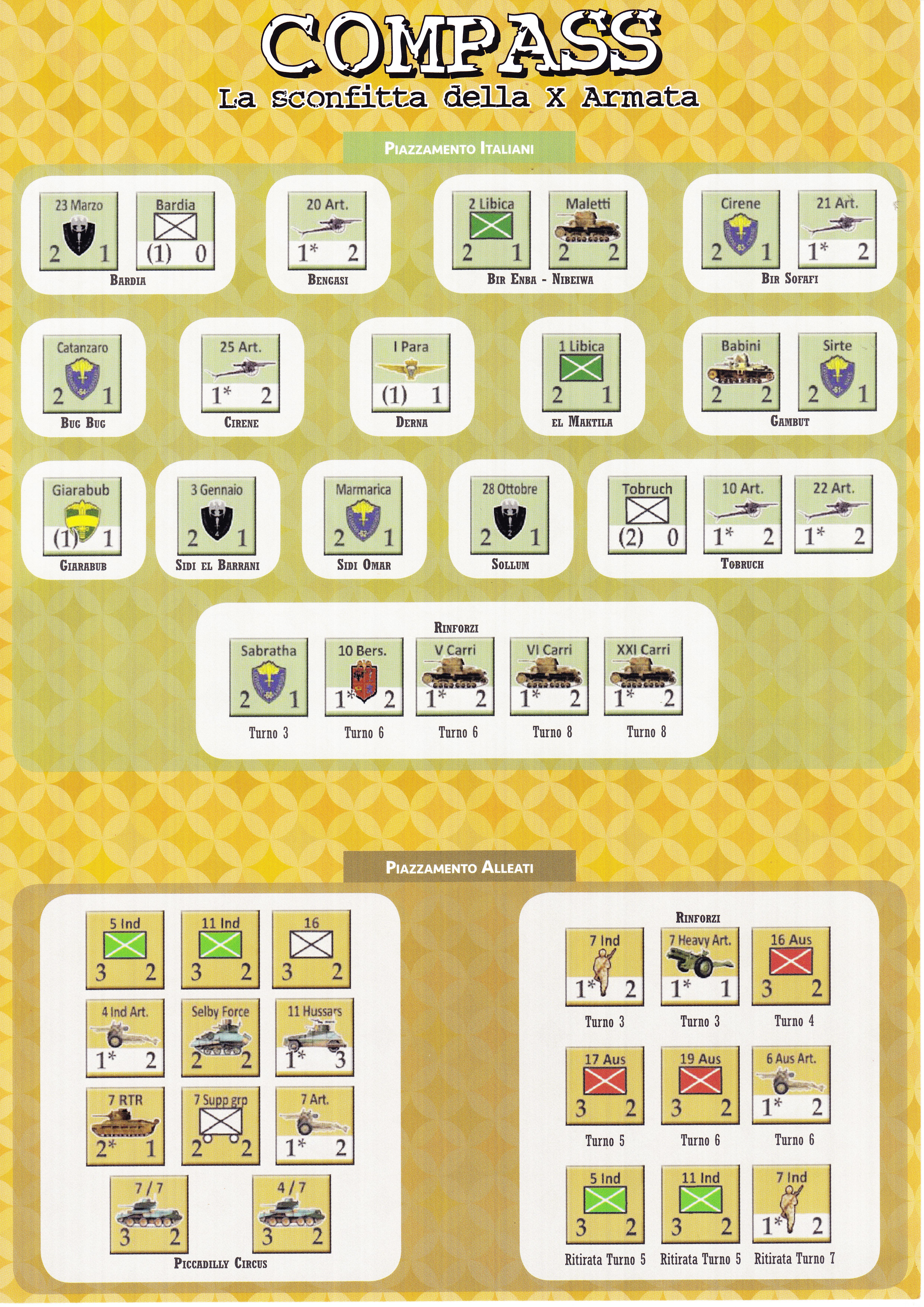Il piazzamento iniziale è fissato dalle regole ed è indicato in un’apposita tabella insieme ai rinforzi. Ogni giocatore ha dei marcatori “Evento” (10 italiani e 15 alleati) da mettere in un sacchetto.
