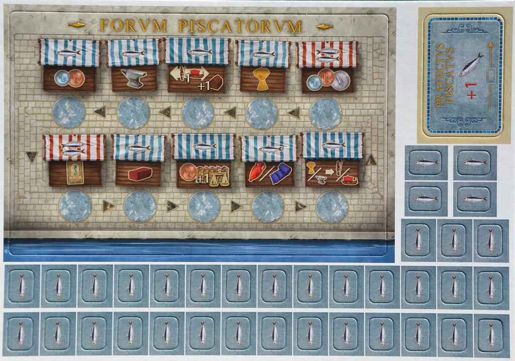 Questa regola può essere applicata a tutte le versioni di Concordia e consiste di una plancia “mercato” in due versioni (una sul fronte e l’altra sul retro), 35 tessere “pesce” (con un pesce sul fronte e due sul retro) ed una tessera “Prefectus Piscatus” che sostituisce la solita carta Prefetto.