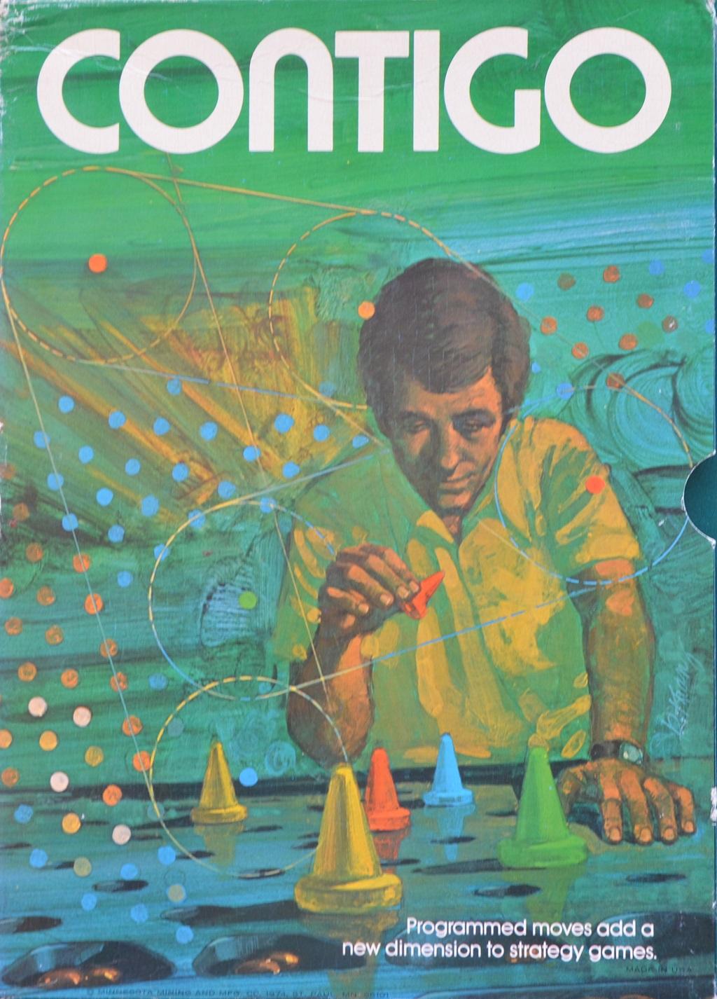 Mescolando un po’ di “Mancala” ad una dose di “Dama Cinese”, con un pizzico di innovazione, CONTIGO crea un gioco di allineamento e cattura piuttosto interessante, da giocare su un tavoliere formato da una griglia 6x6 al centro e da una “corona” di 14 “buchette” che la circondano. Si può giocare in due o in quattro, con la posizione iniziale delle proprie pedine (6 per giocatore in due e 5 in quattro) determinata dalle regole.