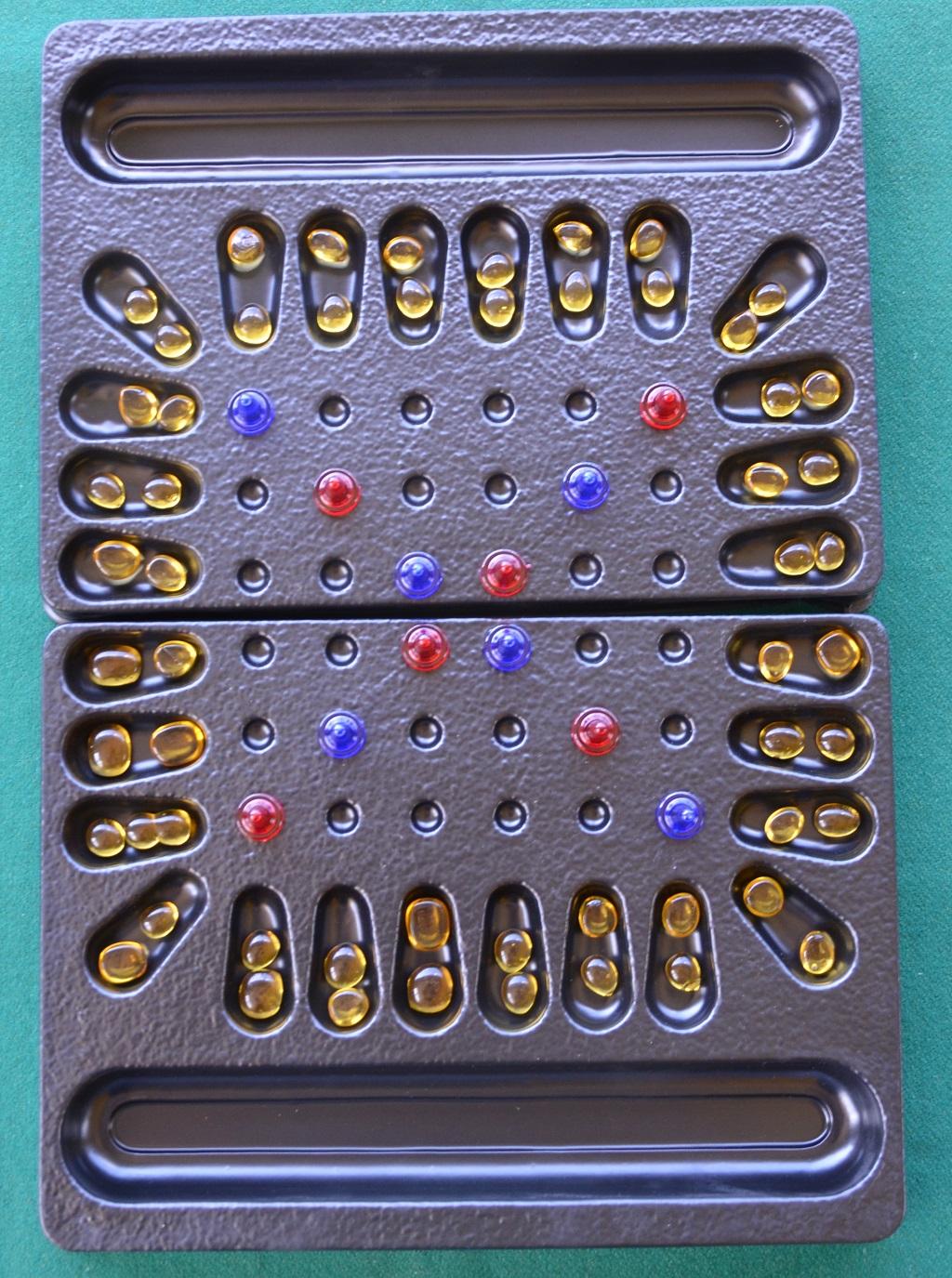 Prima della partita tutte le buchette della “corona esterna” vengono riempite con due “pietre” (in realtà sono delle gocce di vetro giallo): esse servono a regolare i movimenti delle pedine. Il giocatore di turno infatti può decider quale pedina muovere ed in quale direzione, mentre il numero di caselle dello spostamento dipende da quante pietre ci sono nella buchetta verso cui muoverà la pedina.
