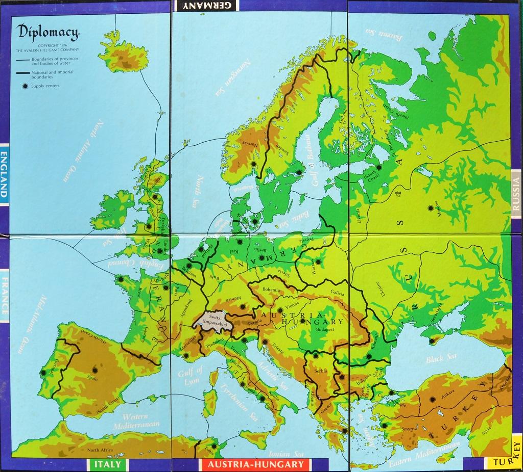 Tutti partono con tre “pezzi” sulla mappa (2 armate e 1 Flotta), ognuno dei quali sarà posizionato in un “centro di rifornimento” all’interno del proprio Paese, salvo l’Inghilterra (2 Flotte e 1 Armata) e la Russia che invece avrà 2 Armate e 2 Flotte (data l’estensione del suo territorio che sbocca su due mari e non permetterebbe quindi una difesa efficace). Ci sono 64 zone nella mappa, 32 delle quali contengono questi “centri” che saranno fondamentali per il gioco.