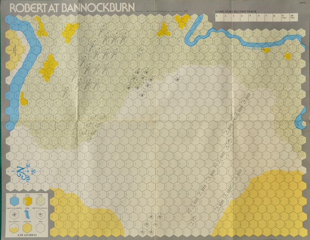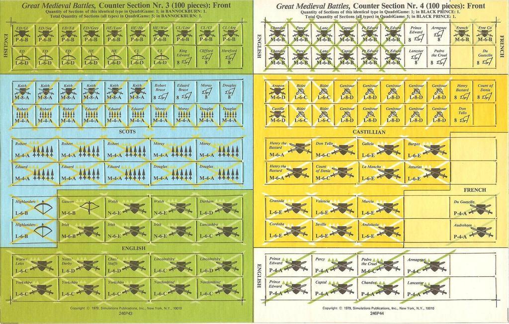 Era il 1979 quando la SPI (Simulation Publications Inc.) decise di pubblicare GREAT MEDIEVAL BATTLES, una scatola con quattro diverse battaglie medievali all’interno, ognuna con la sua mappa, le sue pedine e delle regole specifiche da affiancare al regolamento di base valido per tutte: si parte da quella (ipotetica) di Stonehenge fra l’esercito “buono” del mitico Re Artù e l’avversario cattivo, Modred.e si procede con quelle storiche: Bannockburn Navarrette (o Najera) e Angora (o Ankara).