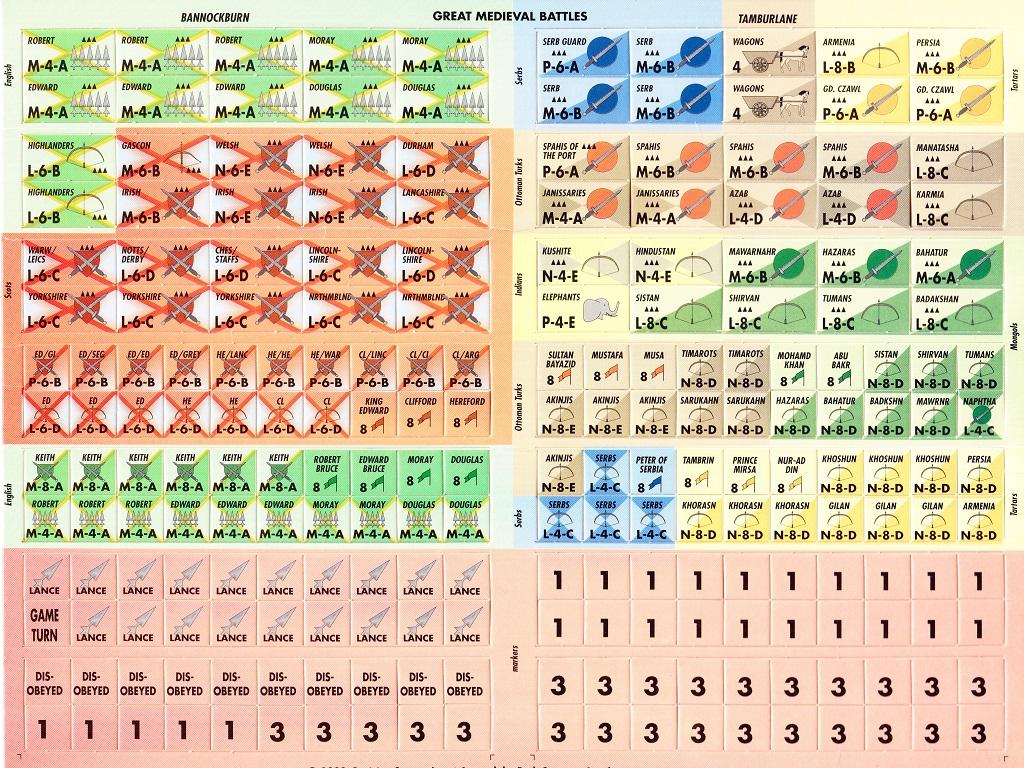 Era il 1979 quando la SPI (Simulation Publications Inc.) decise di pubblicare GREAT MEDIEVAL BATTLES, una scatola con quattro diverse battaglie medievali all’interno, ognuna con la sua mappa, le sue pedine e delle regole specifiche da affiancare al regolamento di base valido per tutte: si parte da quella (ipotetica) di Stonehenge fra l’esercito “buono” del mitico Re Artù e l’avversario cattivo, Modred.e si procede con quelle storiche: Bannockburn Navarrette (o Najera) e Angora (o Ankara).