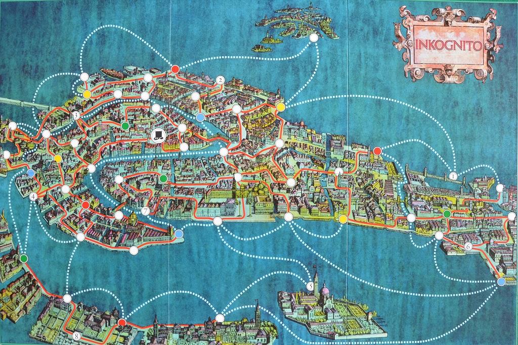 Spesso i “giochi di deduzione” sono presentati in maniera molto spartana e si usano pochi materiali (quasi sempre carte e taccuini) per tener nota degli indizi raccolti: INKOGNITO invece offre un bel tabellone la città di Venezia vista dall’alto e divisa in aree, con i vari rioni della città evidenziati da cerchietti bianchi e collegati fra loro da stradine terrestri o percorsi per barche. Su questo tabellone vengono posati i segnalini “Personaggio” (quattro per giocatore) raffiguranti quattro “maschere” veneziane, ognuna delle quali deve essere collocata su un dischetto del suo colore (le posizioni di partenza sono fisse, ma ogni giocatore decide liberamente in quale casella mettere ogni personaggio). Infine un “Ambasciatore” (pedina nera) viene collocato nell’apposita casella l centro della città.
