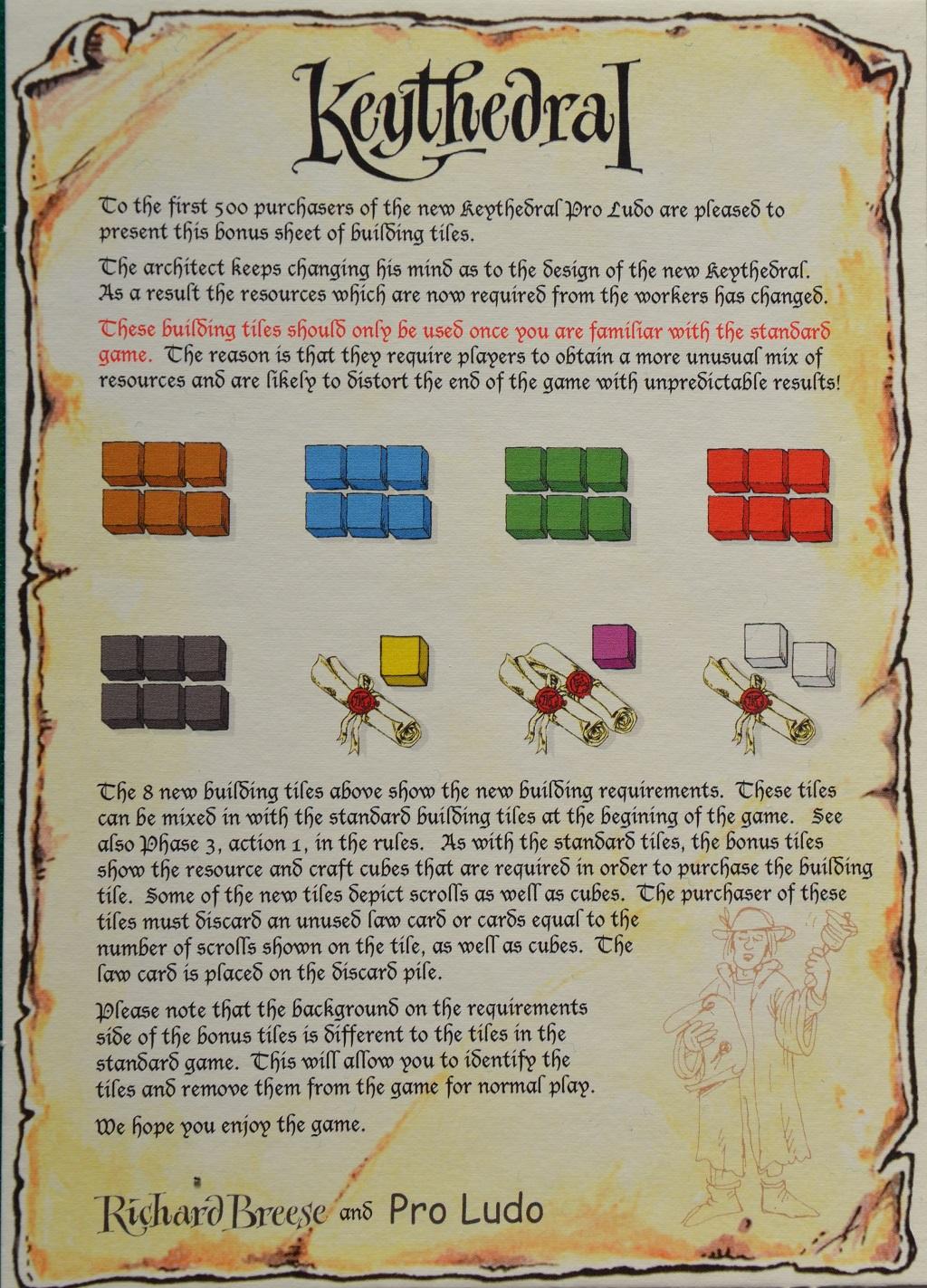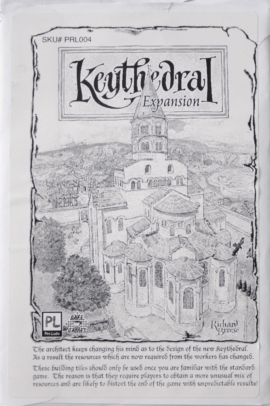 KEYTHEDRAL EXPANSION offre ai giocatori 8 nuove tessere “Cattedrale” di valore “12” che utilizzano anche semplici risorse (però ne servono 6 dello stesso colore) oppure permettono di pagare un solo cubetto di valore elevato (Ferro, Vetro o Oro) facendo però scartare una o due carte “Legge” non ancora utilizzate. Queste tessere dovranno essere mescolate con quelle del gioco base da cui pescare “a caso” quelle della partita.