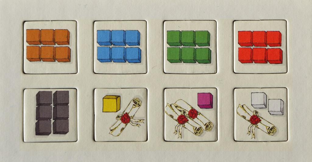 In seguito si possono eseguire varie azioni pagando proprio con i cubetti messi da parte: per esempio trasformando la fattoria in “casa” (da cui usciranno in seguito DUE lavoratori), acquistando ferro, vetro o oro, prendendo una carta “Legge” (che può dare dei bonus al proprio gioco o danni agli avversari), costruendo delle barriere per bloccare i lavoratori avversari, scambiando col mercante due risorse per ottenerne una diversa, ma soprattutto comprando le tessere della Cattedrale (per ottenere i Punti Vittoria (PV) stampati sul loro retro),