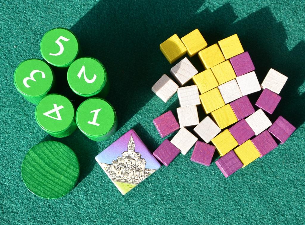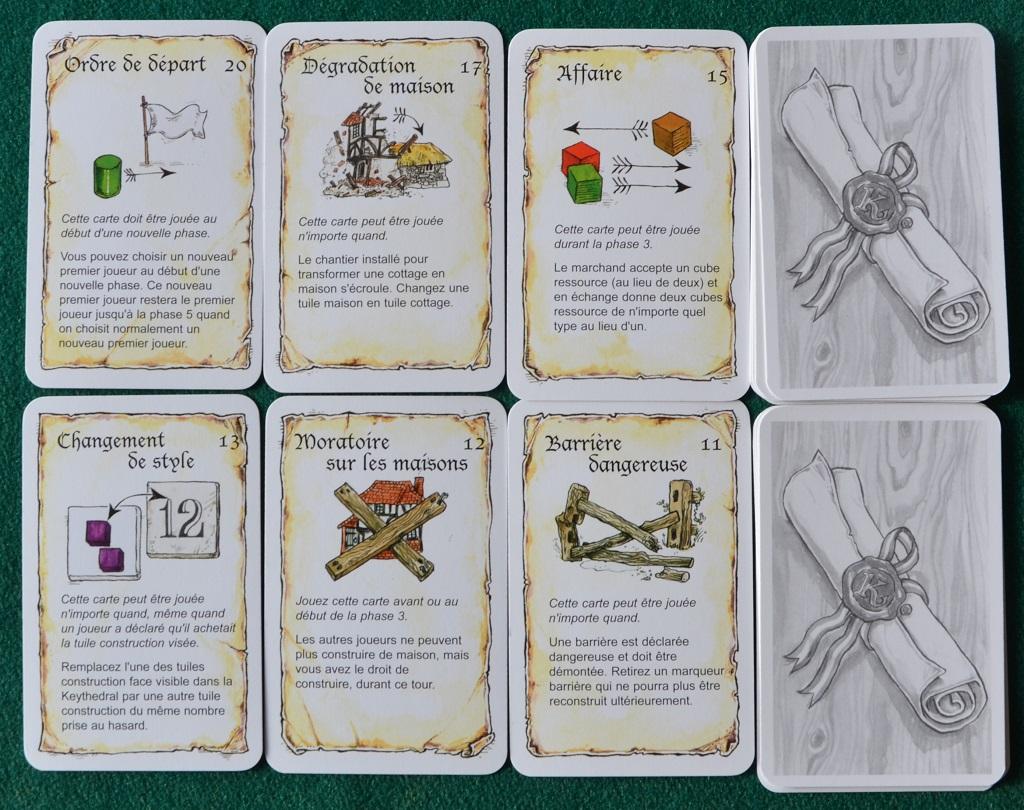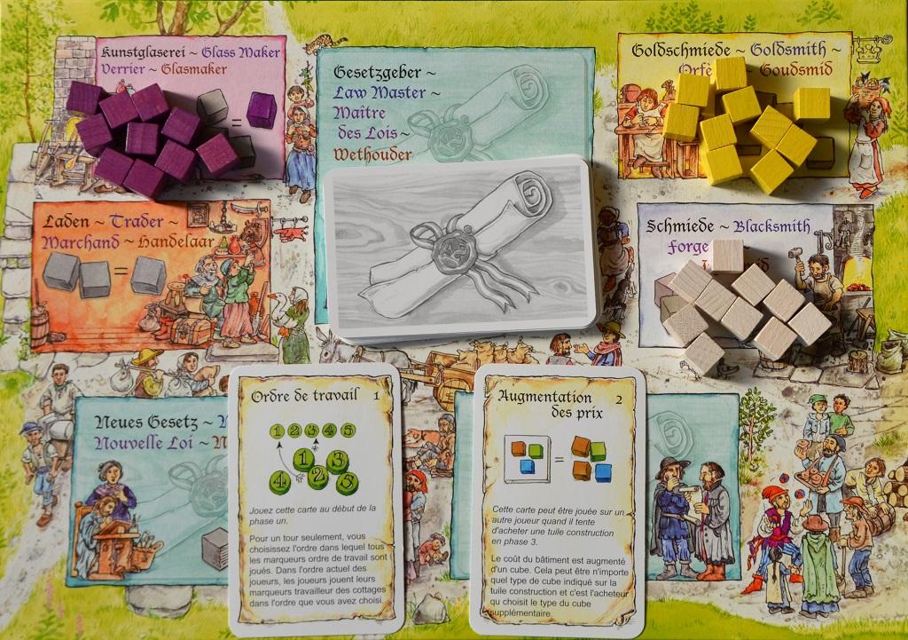 In seguito si possono eseguire varie azioni pagando proprio con i cubetti messi da parte: per esempio trasformando la fattoria in “casa” (da cui usciranno in seguito DUE lavoratori), acquistando ferro, vetro o oro, prendendo una carta “Legge” (che può dare dei bonus al proprio gioco o danni agli avversari), costruendo delle barriere per bloccare i lavoratori avversari, scambiando col mercante due risorse per ottenerne una diversa, ma soprattutto comprando le tessere della Cattedrale (per ottenere i Punti Vittoria (PV) stampati sul loro retro),