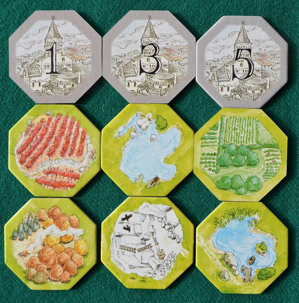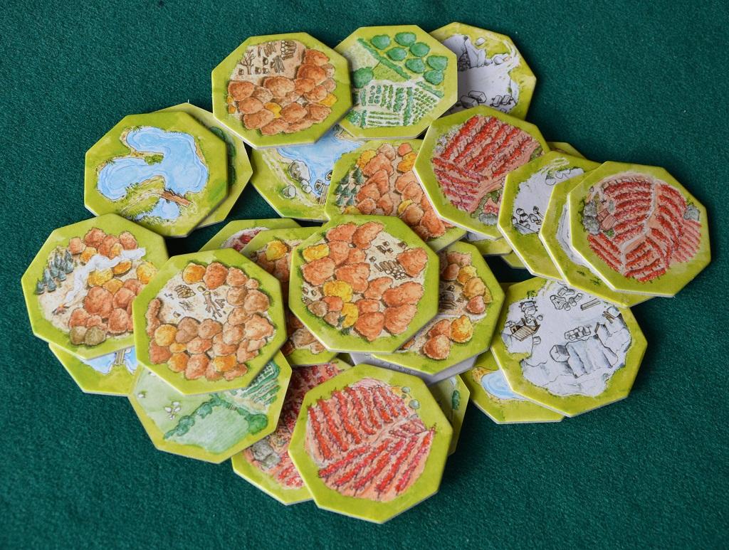 Prima di iniziare la partita i giocatori devono “costruire” il territorio comune, posando ciascuno (in “giri” consecutivi) 5 tessere ottagonali (terreno) e 5 tessere quadrate più piccole (le fattorie): da ognuna di queste ultime uscirà, all’inizio di ogni turno, un lavoratore che andrà a lavorare in uno dei terreni adiacenti per ottenere cibo (nei campi, cubetti verdi), acqua (laghi, blu), roccia (montagna, neri), legno (bosco, marrone) o vino (vigne, rossi). Tutte le risorse ottenute verranno accumulate nel deposito personale (nascosto dietro uno schermo)