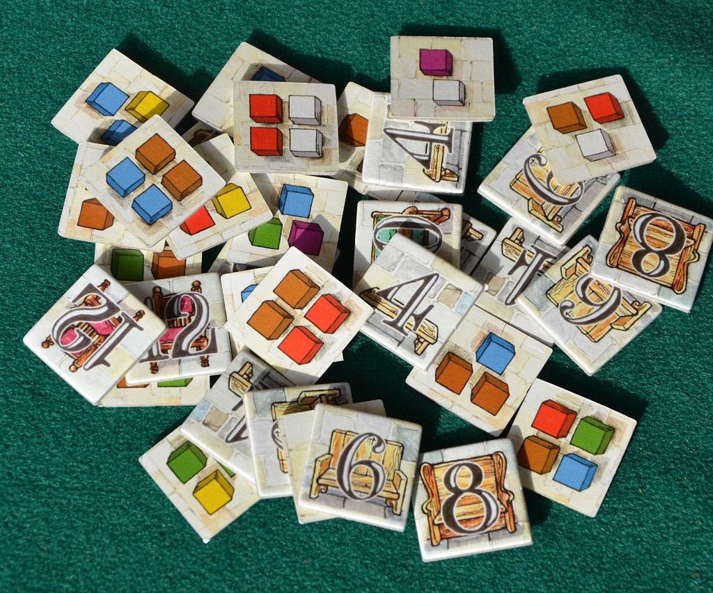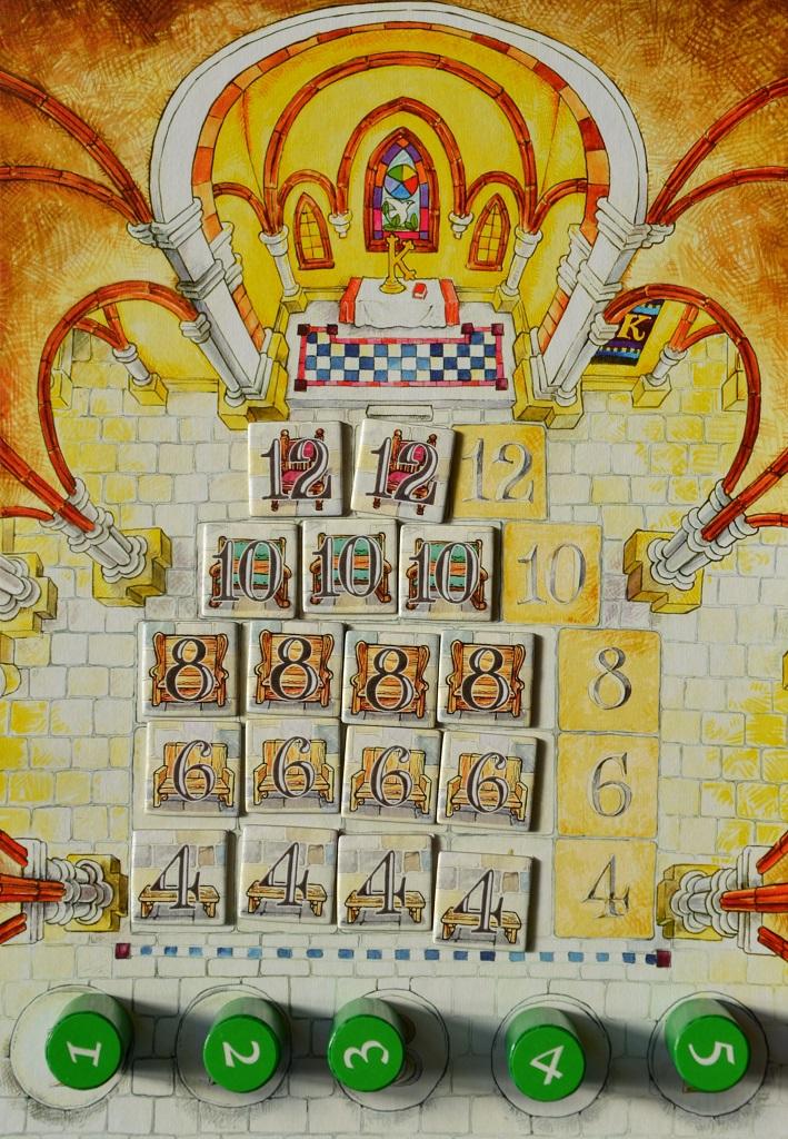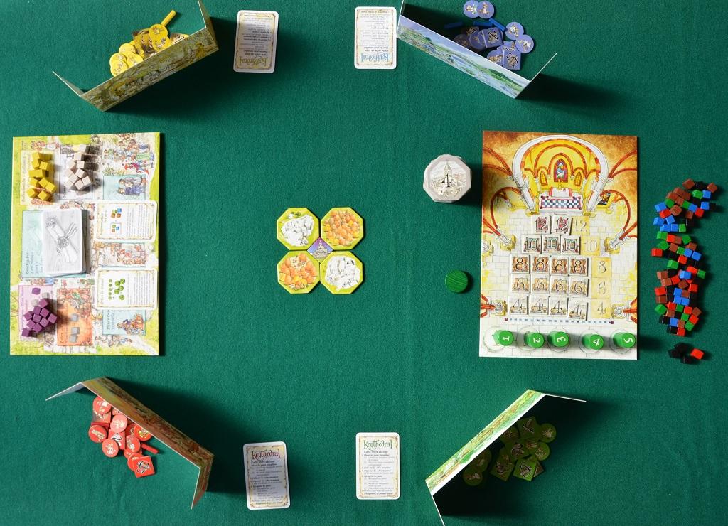 Sul tavolo inizialmente abbiamo solo una plancia con le botteghe degli artigiani (dove potremo procuraci ferro, vetrate e oro per) ed un’altra con il progetto della cattedrale e cinque file di tessere di valore crescente da “4” a “12”: la maggior parte dei punti verrà proprio dall’acquisizione di queste tessere, ognuna delle quali ha un diverso costo in materiali e risorse (per il nutrimento dei lavoratori).