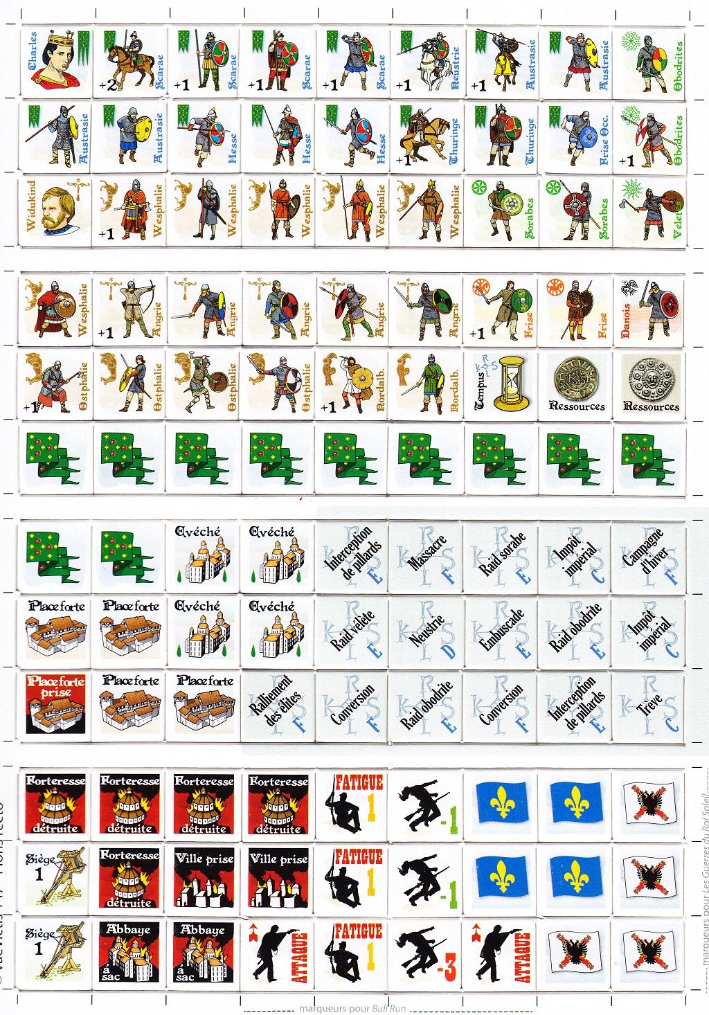 Ogni area sotto il dominio dei Franchi contiene una città o una piazzaforte o un vescovado: le aree della Sassonia contengono invece una fortezza. Su tutte inoltre è stampato un simbolo (una o più monete) che indica quanti PR assicurano alla fine di ogni turno. Il giocatore con più PR ha l’iniziativa (lo schieramento iniziale prevede 7 PR per i sassoni e 10 per Carlo Magno).