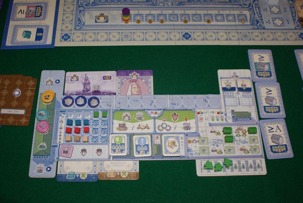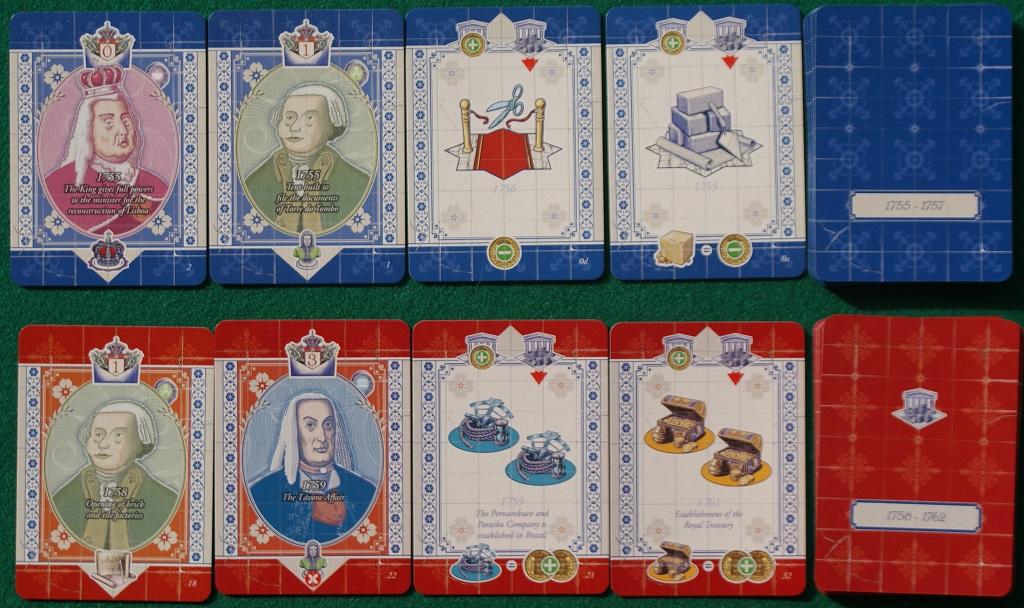 Dopo un impegnativo set-up (c'è tanta roba da preparare, ma chi segue Lacerda ovviamente se lo aspettava già) i giocatori ricevono 5 carte della "prima epoca" (blu: 1755-1757) e, a turno, devono giocarne una per eseguire delle azioni: