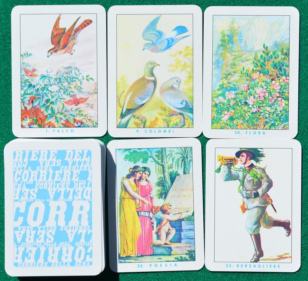 In ogni scatola ci sono due mazzi di 40 carte assolutamente identici ma col dorso di colore diverso (solitamente rosso e blu): ogni mazzo riproduce un diverso disegno (nella maggior parte dei mazzi in commercio si tratta dei disegni originali del ‘700, dal n°1, il Falco, al numero 40, il Veliero).