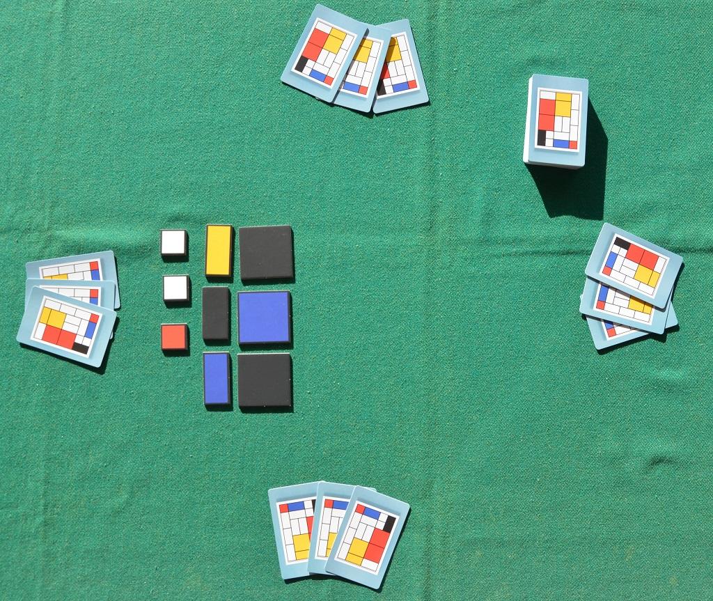 Si tratta di un titolo “astratto” basato sulla posa di tessere in un’area comune a tutti i partecipanti: e infatti astrattista (e cubista) era anche il pittore olandese Pieter Cornelis Mondriaan (meglio conosciuto come Piet Mondrian), di cui vedete un’immagine nella foto 1 qui sopra, con una delle sue opere sullo sfondo.