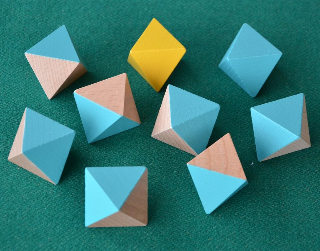 La scatolina di OCTOPUSH contiene 15 doppie tessere “Sfida”, un tavoliere quadrato con una griglia 3x3 di legno e 9 pezzi a forma di doppi “pentaedri” a base quadrata: