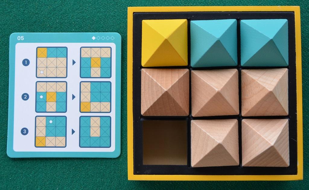 Provando e riprovando le varie sfide ho capito il motivo per cui è stata scelta quella strana forma per i pezzi: perché basta spingerne uno sul vertice per farlo ribaltare nella casella vuota adiacente. Ingegnoso no?