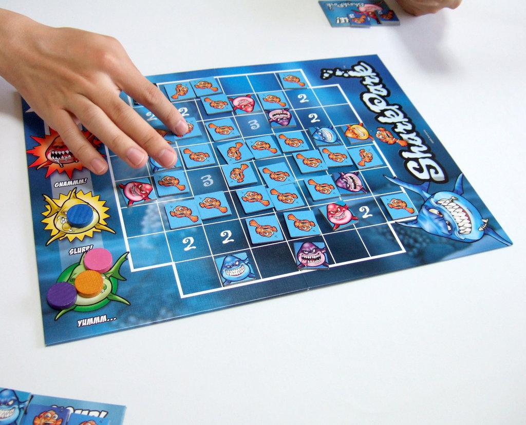 SHARKPARK è un gioco per tutta la famiglia dove i partecipanti si mettono nei panni di uno squalo e cercano di mangiare il maggior numero di pesciolini: tuttavia nessun pescecane può inghiottire direttamente i pesciolini (ed è qui l’originalità del gioco) ma possono solo spaventarli cercando di farli finire… proprio dentro la bocca di un loro “collega”.