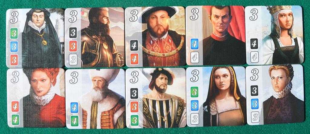Quando un giocatore ha nella sua riserva un numero di carte del colore e del tipo indicati su uno dei nobili può reclamare quella tessera e metterla nella sua riserva.
