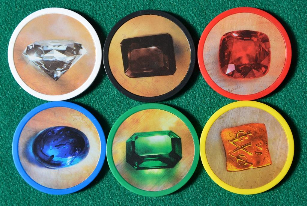 Infine si mettono in tavola a 6 pile di gettoni di plastica pesante, delle dimensioni delle fisches del Casinò, 5 delle quali rappresentano delle pietre preziose di diverso colore (smeraldi, zaffiri, rubini, diamanti e onice) mentre l'ultima pila (oro) funzionerà da Jolly.