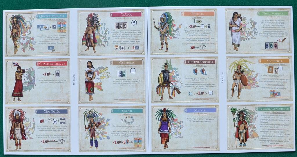 Il tabellone è composto da due “sezioni” ben distinte: una serie di 8 caselle “Azioni” disposte in un anello esterno (e reminiscenti della famosa “Roundel” di Mac Gerdts) e quattro aree centrali: zona templi, piramide, sentiero dei morti e tracciato calendario.
