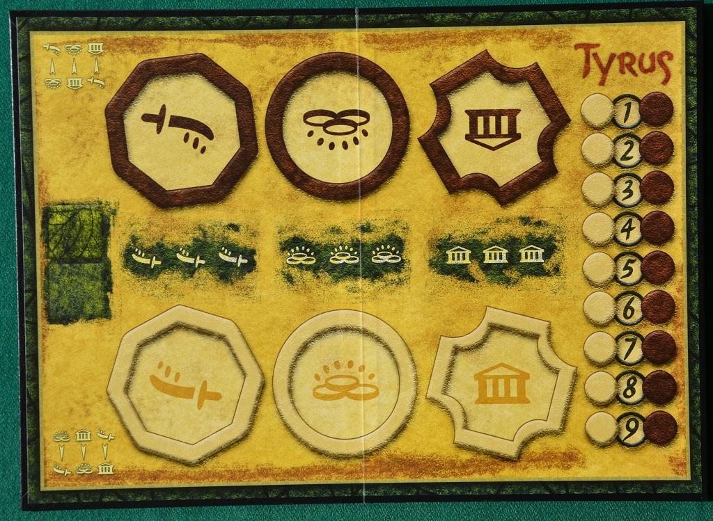 TYRUS è un gioco “astratto” che utilizza dei componenti molto belli ed è ambientato in una città, di una imprecisata epoca antica, al momento in cui i cittadini, divisi in due “partiti”, sono chiamati a rinnovare le principali cariche: Gran Sacerdote, Comandante Militare e Capo della Gilda dei Mercanti.