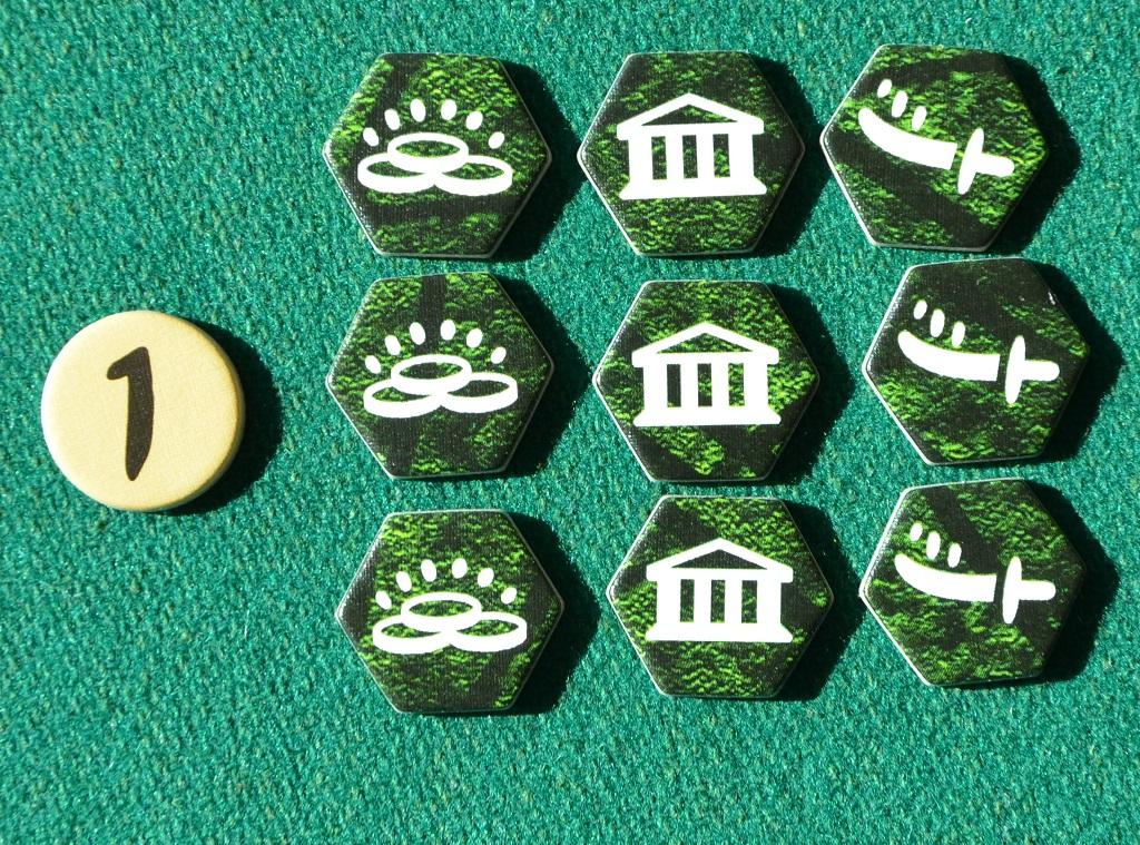 Sul tabellone sono stampati tre diversi edifici peer ogni giocatore (Tempio, Cittadella e Mercato): a sinistra viene piazzata una pila di 9 tessere “Elezione” (tre per ogni “carica”), mentre a destra c’è il tracciato dei Punti Vittoria (PV). Al centro, di fronte ad ogni edificio, vengono posizionati 9 gettoni esagonali (tre per ogni “carica”). I giocatori ricevono 30 blocchi di legno divisi in tre serie (una per ogni “carica”), ognuna delle quali ha dei valori che vanno da “1” a “10” stampati su un solo lato.