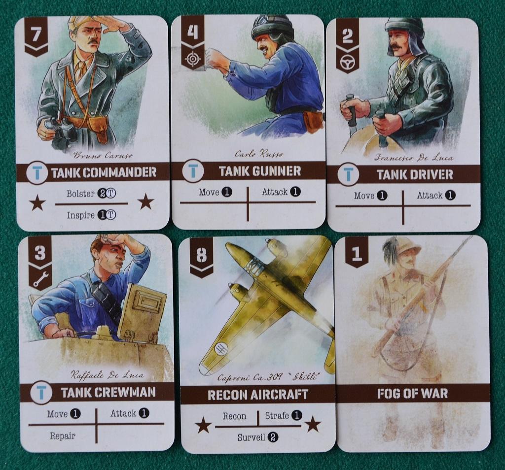 Il cuore di UNDAUNTED NORTH AFRICA, come abbiamo anticipato, sta nelle carte e nella meccanica di “Deck Building” utilizzata prima di giocarle: si tratta in pratica di aumentare pian piano la propria mano iniziale cercando al contempo di sbarazzarsi delle “Fog of War” che costituiscono un inutile “peso” e rischiano di ridurre notevolmente le azioni di ogni turno. Vediamo quindi un po’ meglio i tipi di carte disponibili:
