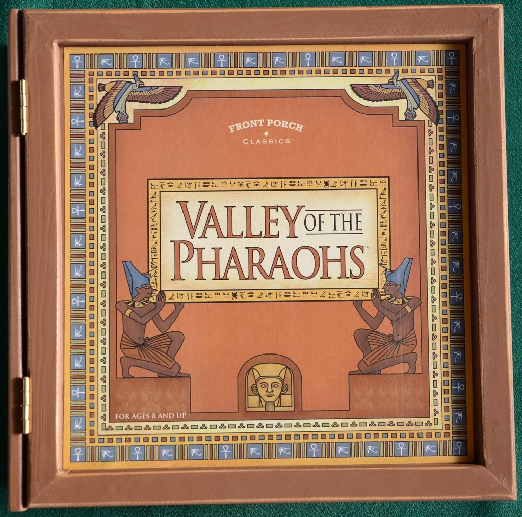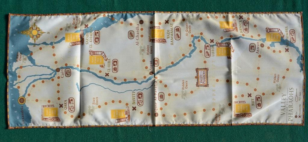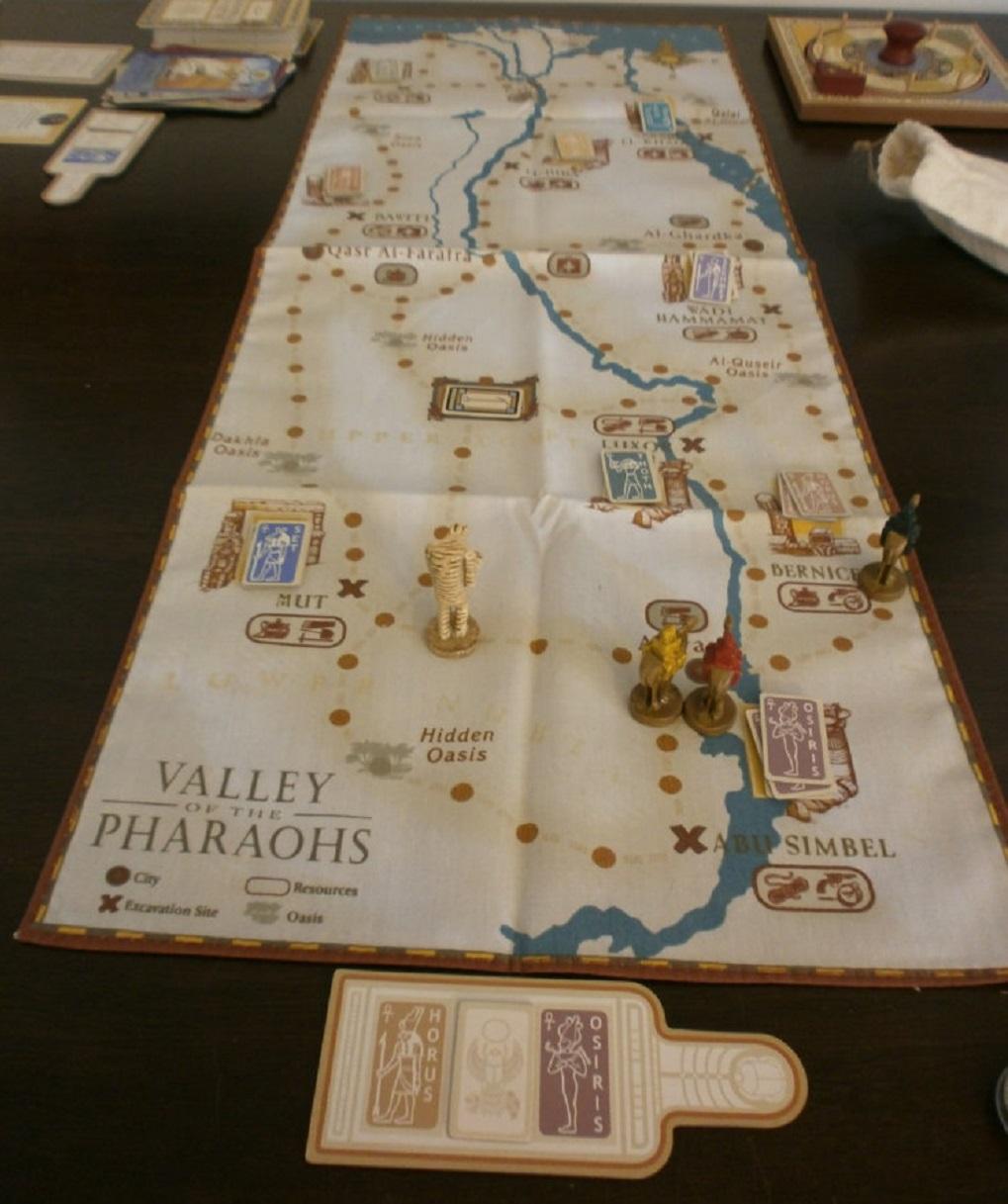 Dal punto di vista grafico ed estetico … tanto di cappello a VALLEY OF THE PHARAOHS, a cominciare dalla scatola di legno che si apre a libro, passando poi alle miniature di metallo verniciato a mano, alle monete metalliche e al tabellone di tela dipinta da aprire sul tavolo per mostrare la valle del Nilo (siamo in Egitto) con le sue città, le sue oasi ed una serie di località dove i giocatori (nei panni di egittologi) cercheranno tracce dell’antica civiltà.