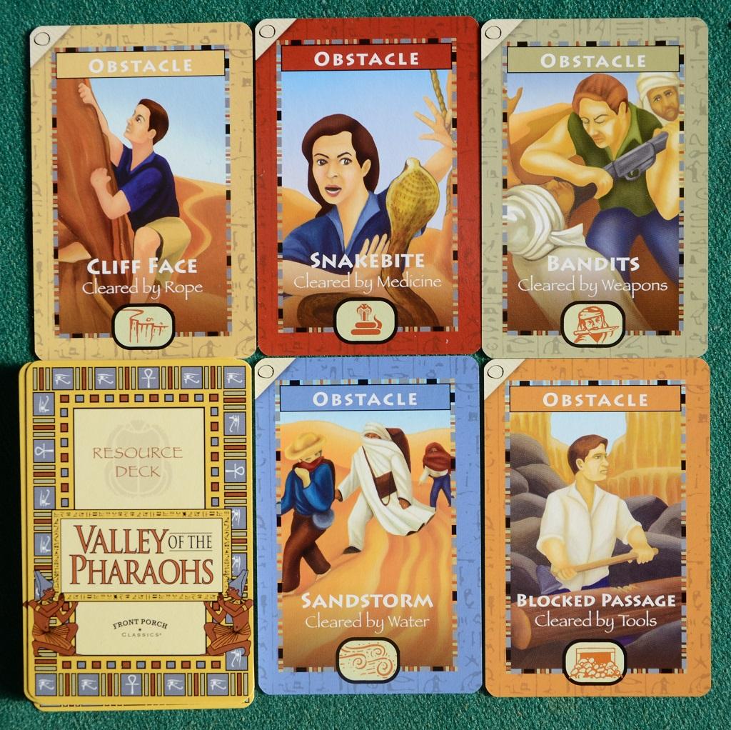 Le carte Ostacolo sono l’ultima azione del proprio turno e se ne può giocare una sola alla volta, posandola di fronte ad un avversario: questi, all’inizio del suo turno, ha la possibilità di eliminarla saltando completamente il suo turno oppure pagare 2 monete a chi ha giocato l’ostacolo o, in alternativa, facendogli pescare una carta risorsa. Il giocatore che fa i dadi doppi invece prende il controllo della mummia e la muove a piacere cercando di raggiungere e “maledire” uno o più avversari (i quali dovranno stare fermi un turno).