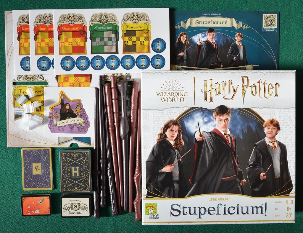 - 9 Tessere "Vessillo" (55x80 mm) da sfustellare: 3 x rosso (Grifondoro) e 2 x verde (Serpeverde), giallo (Tassorosso) e blu (Corvonero)