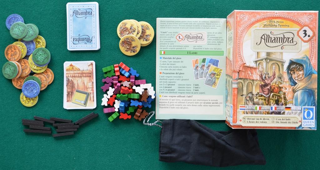 - 12 Carte "Ladro" (58x89 mm): 3 x denaro giallo, arancio, verde e blu per scenaruio "L'ora deri Ladri"