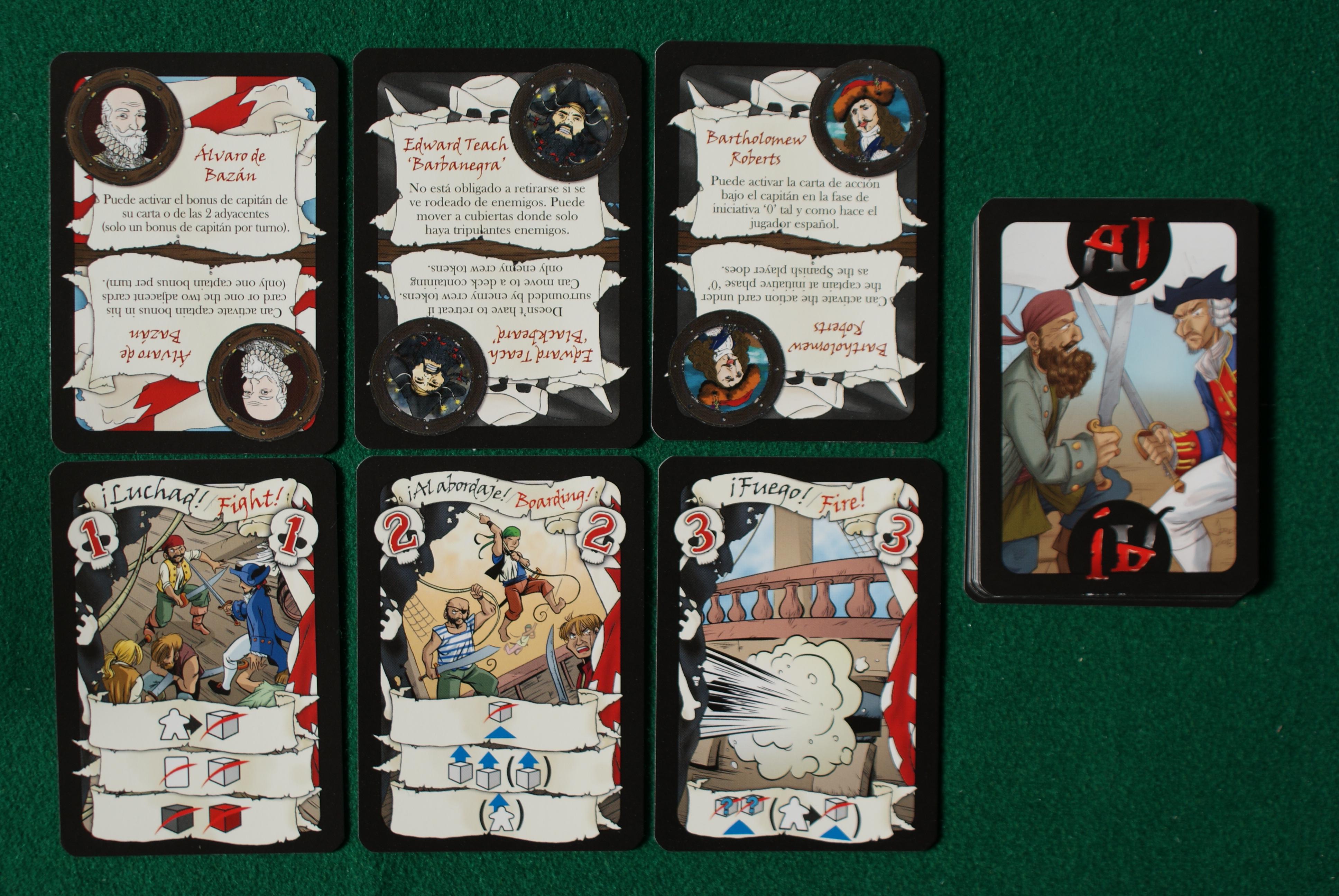 Si piazzano 5 carte in tavola che mostrano due navi molto vicine: a sinistra si vedono le due sezioni di prua (il pirata posa il suo Capitano sulla sua nave), a destra le sezioni di poppa (lo spagnolo posa il suo Capitano sulla sua nave) ed in mezzo tre carte con i "ponti" delle due navi.
